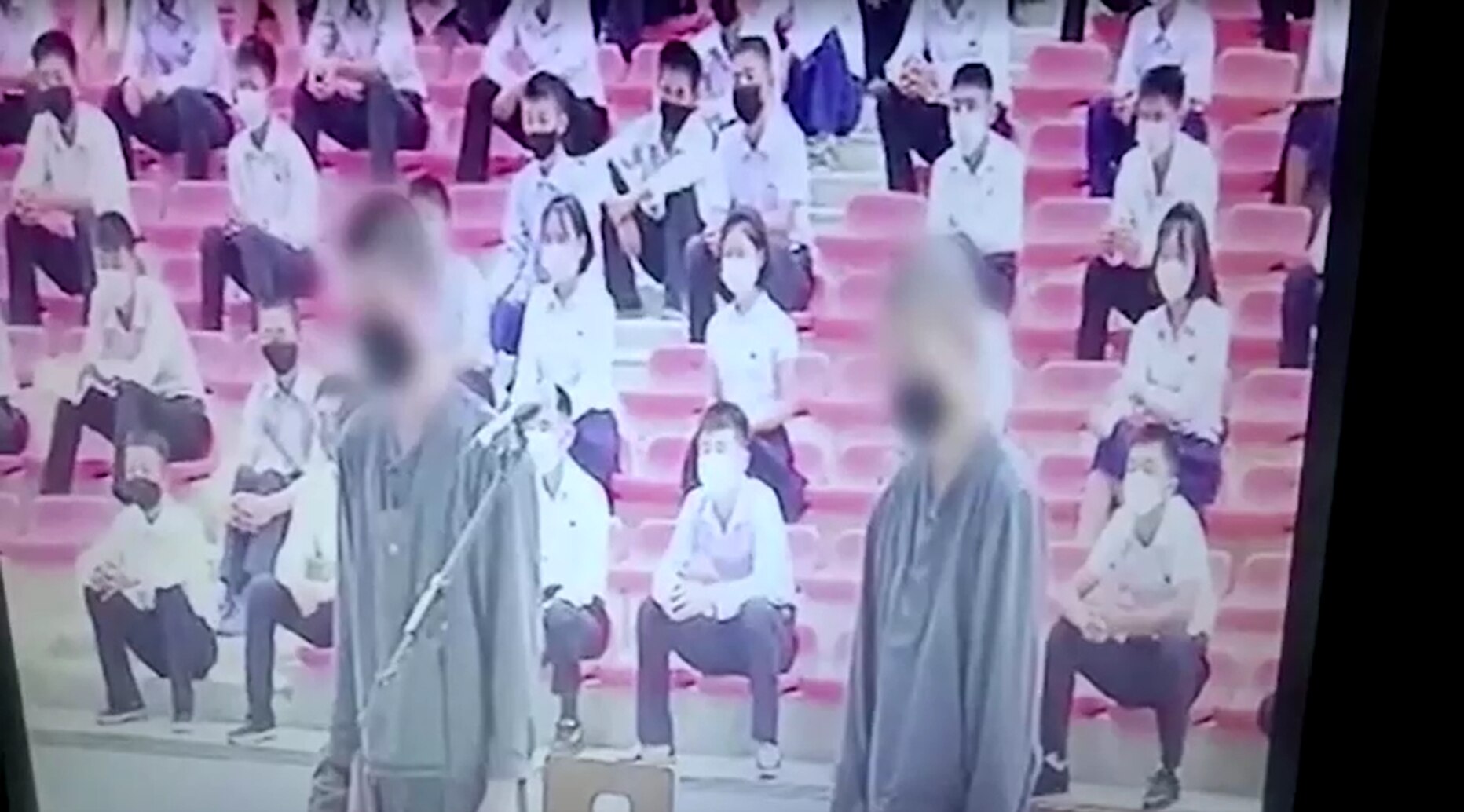 На видео, снятом властями Северной Кореи, показан крупный публичный судебный процесс, в ходе которого на двух студентов в серой форме надевают наручники, а около 1000 студентов наблюдают за происходящим в аудитории.